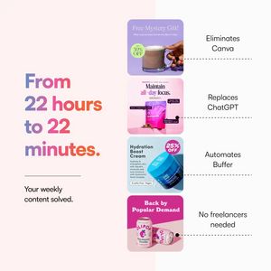 Questo template quadrato è pensato per promuovere un software di automazione contenuti con AI per social media. La metà sinistra è dominata da una promessa enorme e immediata—“From 22 hours to 22 minutes.”—in un sans moderno, con accenti sfumati rosa/viola che fanno risaltare il risultato. Sotto, una riga breve (“Your weekly content solved.”) chiude il messaggio senza appesantire. A destra trovi quattro card arrotondate impilate, ognuna con un esempio di creatività (promo sconto, prodotto focus, crema skincare con -25%, bevanda “back in stock”), collegate tramite linee tratteggiate a benefit rapidi come “Eliminates Canva” e “No freelancers needed”. È una dimostrazione “per campioni”: perfetta per TOF perché rende concreto ciò che l’AI produce anche per un pubblico ancora “non consapevole”, abbassando l’attrito e la diffidenza. Per personalizzarlo, sostituisci le card con i tuoi post reali, aggiorna la metrica tempo con i tuoi numeri e cambia i confronti (strumenti eliminati/semplificati) in base al tuo stack. La struttura funziona in molti settori perché visualizza varietà di output e risolve costo/tempo.