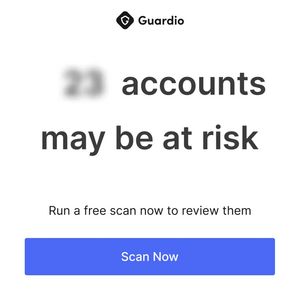 Questo template funziona perché unisce paura e urgenza a una soluzione immediata e a basso attrito. L’headline mette in scena una minaccia chiara (“accounts may be at risk”), perfetta per utenti “unaware” che non stanno ancora cercando protezione. Il numero sfocato suggerisce un esito personalizzato e attiva la curiosità: “quanti sono i miei?”. La promessa di “free scan” è coerente con il top-of-funnel: prima di valutare feature e prezzi, l’utente vuole una conferma rapida. Il layout bianco minimale e la tipografia pulita comunicano affidabilità—fondamentale nel settore cybersecurity—mentre la CTA blu, grande e contrastata, riduce l’indecisione e guida l’occhio a un’unica azione. In sintesi: un messaggio, un’azione, massima leggibilità e copy orientato al beneficio per accompagnare l’utente verso la prima prova.