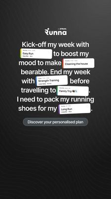 Questo template 9:16 in formato Story è pensato per promuovere un’app di piani di corsa personalizzati o un servizio di coaching in abbonamento. Il visual è minimal e “premium”: sfondo antracite con leggere linee topografiche, tipografia bianca molto leggibile e una grande frase centrale che suona come un vero diario settimanale. Le schedine stile calendario (Easy Run, Strength Training, Long Run, più attività quotidiane) comunicano subito il valore chiave: un programma che si adatta alla vita reale. A livello strategico lavora in TOF su utenti ancora “unaware”: mette in scena il caos della settimana e il bisogno di energia/organizzazione, poi introduce la soluzione come struttura semplice e guidata. I trigger principali sono comodità e motivazione: vedere gli slot di allenamento tra impegni domestici e viaggi rende l’obiettivo credibile e raggiungibile. Il CTA a pillola, ben contrastato (“Discover your personalised plan”), abbassa l’attrito e invita a fare il primo passo. È facilmente personalizzabile cambiando brand, testo-diario e tipologie/ore degli allenamenti in base a principianti, runner avanzati o professionisti sempre di corsa.