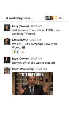 Questo template verticale 9:16 in stile Story riproduce una chat “tipo Slack” nel canale # marketing-team, ideale per promuovere un software SaaS legato a collaborazione, marketing ops o gestione campagne. Il visual è volutamente “UI-first”: sfondo bianco pulito, testo nero ad alta leggibilità, avatar, orari, icone di reazione e messaggi brevi. Il gancio è la conversazione: un owner nota “un nostro annuncio su ESPN”, la CMO conferma che la campagna CTV è live, e l’intern chiude con un meme entusiasta (“IT’S HAPPENING!”). È una combinazione di curiosità, umorismo e novità, perfetta per una fase top-of-funnel con pubblico non ancora consapevole: non sembra una pubblicità, sembra un momento reale di team. La riprova sociale è implicita: apparire su un grande network comunica scala e affidabilità senza enumerare feature. Puoi personalizzare nomi, titolo del canale, riferimento alla piattaforma (Hulu/Roku/YouTube TV) e sostituire il meme con uno più brand-safe, aggiungendo in basso una CTA semplice verso demo o onboarding.