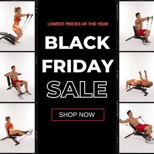 Questo template funziona perché combina due leve fortissime: risparmio e aspirazione. Il pannello centrale nero con “BLACK FRIDAY SALE” gigantesco crea riconoscibilità immediata e senso di urgenza, perfetto in top of funnel quando l’utente scorre velocemente. Il collage laterale effetto pellicola fa invece “educazione” in pochi secondi: le diverse foto di esercizi mostrano la versatilità dell’attrezzo e abbattono i dubbi di un pubblico ancora poco consapevole, che magari non sa cosa permetta di fare una panca con bande elastiche. Il set fotografico pulito concentra l’attenzione su movimento e prodotto, mentre gli accenti rossi guidano verso messaggio prezzo e CTA. In linea con le best practice, c’è un unico headline dominante, visual di supporto chiari e un “Shop Now” inequivocabile, senza sovraccaricare di testo.