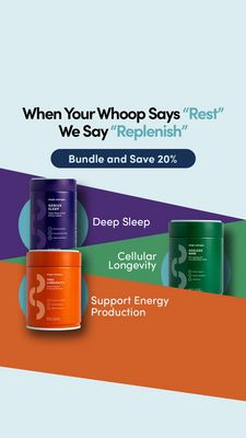 Questo template in formato Story è pensato per promuovere un bundle di integratori orientato al recupero e all’health optimization quotidiano. L’headline parte da un riferimento concreto alla routine di chi usa wearable e app di tracking (“Quando il tuo Whoop dice ‘Rest’…”) e lo trasforma in una promessa di utilità immediata (“Replenish”). Subito sotto, un pulsante ovale scuro con “Bundle and Save 20%” rende il vantaggio economico chiarissimo: è un incentivo perfetto per la fase di considerazione, quando l’utente sta confrontando opzioni e cerca un motivo per scegliere ora. La parte bassa mostra tre flaconi ben visibili (viola, verde e arancione) appoggiati su fasce diagonali a colori saturi che trasmettono energia e guidano lo sguardo. Ogni fascia include un beneficio sintetico—sonno profondo, longevità cellulare, supporto alla produzione di energia—così il bundle appare “ragionato” e non casuale. È facile personalizzare sostituendo i packshot, riscrivendo i tre benefit in base allo stack e cambiando il riferimento al wearable con un’altra situazione di routine (allenamento, viaggio, settimana stressante).