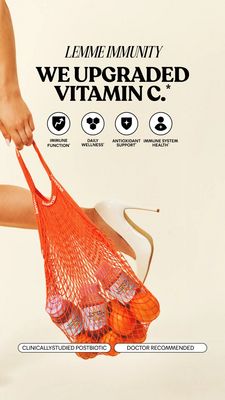 Questo template Story 9:16 è pensato per annunciare un upgrade di caramelle gommose alla vitamina C o un integratore per le difese immunitarie. Il design è pulito e “premium”: sfondo beige caldo, tipografia serif nera ad alto contrasto e headline centrale (“We upgraded Vitamin C.”) che cattura subito l’attenzione e trasmette autorevolezza. Subito sotto, quattro icone in cerchi con benefit chiari (funzione immunitaria, benessere quotidiano, supporto antiossidante, salute del sistema immunitario) trasformano le promesse in punti rapidi da leggere—perfetti per un pubblico già consapevole del prodotto, in fase di valutazione (mid-funnel). La foto lifestyle crea curiosità: una mano regge una rete arancione stile shopper con il barattolo dell’integratore e arance, collegando visivamente il claim alla fonte “vitamina C” in modo editoriale. In basso, due badge a pillola (“postbiotico studiato clinicamente” e “consigliato dai medici”) rafforzano fiducia e sicurezza. Personalizza colori, pack, testi delle icone e badge mantenendo l’ampio respiro del layout.
