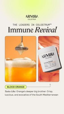 Questa creatività è perfetta per la fase di considerazione (MOF) su utenti già “solution aware”: dà per scontata la conoscenza del colostro e lavora sui due driver decisivi—chiarezza del beneficio e fiducia nel gusto. L’headline enorme “Immune Revival” fissa la promessa, mentre il layout diviso offre insieme prova del prodotto (bustina ben visibile) e desiderabilità sensoriale (bevanda agrumata con schiuma e colatura che suggerisce miscelazione e piacere). Il badge “Blood Orange” e la tasting note attivano curiosità e immaginazione del sapore, abbassando il rischio percepito tipico dei drink mix. Spazi puliti e serif elegante comunicano qualità e affidabilità, coerenti con un posizionamento premium. Inoltre la struttura si presta a una serie di gusti, facilitando confronto e ripetizione del messaggio senza perdere riconoscibilità.