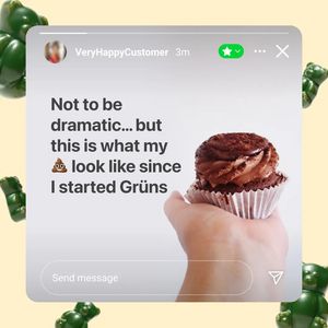 Questo template quadrato promuove una polvere di “greens”/superfood quotidiana con l’estetica di uno screenshot di Instagram Stories, firmato da “VeryHappyCustomer”. A sinistra domina un headline grande in grigio scuro; a destra c’è una mano che regge un cupcake al cioccolato, usato come elemento ironico e “confessionale” per agganciare l’attenzione. Il contenuto è inserito in un riquadro arrotondato con interfaccia social (barra in alto, icone, campo “Send message”), su un fondo crema con caramelle/orsetti gommosi verdi sparsi che danno un richiamo immediato al mondo “greens”. L’approccio è perfetto per TOF awareness su pubblico non consapevole: combina curiosità e umorismo (emoji provocatoria) con riprova sociale, perché sembra un post reale di un cliente. Funziona perché riduce le difese, crea stop scroll e rende il messaggio memorabile senza risultare “da pubblicità”. È personalizzabile cambiando username, visual “problema” e nome prodotto, mantenendo lo stile Story che comunica autenticità.