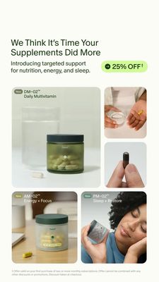 Funziona perché unisce aspirazione (una routine quotidiana più “efficace” e ordinata) e curiosità (“è ora che i tuoi integratori facciano di più”), combo ideale in fase top-of-funnel con pubblico poco consapevole. Il collage racconta subito un sistema: un solo brand, più benefici mirati (nutrizione, energia, sonno), evitando muri di testo e riducendo lo sforzo cognitivo. Spazi bianchi e verdi soft richiamano codici visivi di brand clinici e sostenibili, mentre l’unico elemento acceso—il badge “25% OFF”—crea un passo successivo chiaro senza trasformare l’annuncio in “promo aggressiva”. Le immagini d’uso (acqua, capsula) e la scena relax rendono concreti benefici altrimenti astratti, best practice nel wellness dove i risultati non sono sempre dimostrabili in modo immediato. Lo spazio per le note in basso aggiunge fiducia e percezione di professionalità.