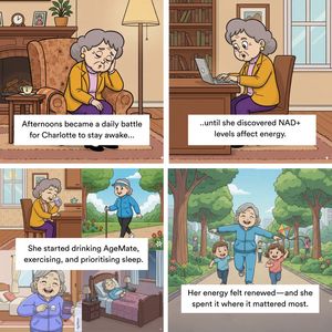 Questo template quadrato per integratori usa un formato “fumetto” a 4 riquadri per raccontare una trasformazione immediata: da stanchezza pomeridiana a energia ritrovata grazie al supporto NAD+. La griglia 2x2 alterna scene illustrate molto leggibili: una donna anziana spossata in salotto, poi al laptop mentre scopre il legame tra livelli di NAD+ ed energia, quindi la nuova routine (bevanda/integratore, movimento e sonno), e infine una passeggiata al parco con i bambini. In ogni riquadro c’è una card bianca con testo nero in font pulito, pensata per scorrimenti rapidi. La palette calda e domestica (beige e marroni) lascia spazio a verdi e azzurri più luminosi nell’ultima scena: un contrasto che rende visiva la “rinascita” e attiva aspirazione e immedesimazione. A livello di strategia è perfetto per TOF awareness su pubblico non consapevole: parte dal problema quotidiano, inserisce un gancio educativo semplice e chiude con un beneficio di vita reale. È facile personalizzarlo cambiando personaggio, nome prodotto, claim scientifico e momento finale di felicità/energia.