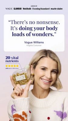 Questo template funziona perché mette in fila i segnali di fiducia nello stesso ordine con cui un pubblico solution-aware valuta un integratore. L’intestazione “Loved by” con loghi in stile testata presta autorevolezza, mentre la citazione enorme agisce da endorsement “terzo”, abbassando la percezione di rischio. Le stelle di valutazione aggiungono una scorciatoia mentale immediata, perfetta nello scroll veloce delle Stories. La modella che tiene il flacone fornisce prova concreta del prodotto (capsule reali, packaging chiaro) e introduce un elemento aspirazionale senza risultare aggressivo. In fase di considerazione (MOF) le persone stanno confrontando alternative: l’unione tra testimonianza e beneficio quantificato (“20 vital nutrients”) aiuta a motivare la scelta. Spaziatura pulita, contrasto alto e tipografia leggibile rispettano le best practice per una lettura mobile rapida e focalizzata.