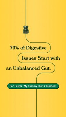 Questo template in formato Story è pensato per promuovere caramelle gommose per il benessere intestinale o integratori per la digestione. Lo sfondo giallo senape, molto luminoso, cattura subito l’attenzione; una linea verde scuro “digestiva” che scende e curva lungo la creatività guida lo sguardo in modo naturale fino al claim. In alto, un piccolo orsetto gommoso comunica immediatamente la forma del prodotto senza bisogno di una foto packshot: il risultato è minimale, pulito e contemporaneo. Il titolo centrale in font serif (“70% of Digestive Issues Start with an Unbalanced Gut.”) sfrutta un trigger di curiosità e di preoccupazione salute, perfetto per la fase TOF: trasforma un fastidio comune in un tema di squilibrio del microbiota e stimola a scoprire la soluzione. La barra verde a forma di pillola in basso è lo spazio ideale per una promessa semplice e umana (“For Fewer ‘My Tummy Hurts’ Moment”), con tono amichevole e non aggressivo. Personalizza sostituendo la statistica, inserendo il pack vicino alla barra e adattando icona/verde al tuo brand mantenendo l’alta leggibilità mobile.