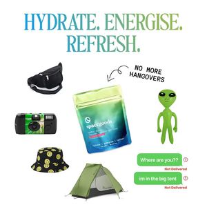 Questo template quadrato è pensato per promuovere un mix di elettroliti in bustina o un integratore per l’idratazione, con una headline grande e pulita: “HYDRATE. ENERGISE. REFRESH.” in un serif sfumato dal blu al verde. Il design gioca su uno sfondo bianco molto arioso: al centro c’è la busta prodotto leggermente inclinata, mentre intorno compaiono ritagli “pop” (marsupio, fotocamera usa e getta, cappello a secchiello con faccine, tenda da campeggio) più un alieno verde. Una freccia disegnata a mano e la frase “NO MORE HANGOVERS” creano immediatamente curiosità, e le bolle stile iMessage aggiungono un contesto ironico e super condivisibile. A livello strategico è perfetto per il top of funnel su pubblico “non consapevole”: l’umorismo e la stranezza fermano lo scroll senza risultare tecnici, poi il packshot e l’aggancio “post serata” chiariscono il beneficio in un secondo. Funziona bene per brand che puntano su festival, viaggi e nightlife. Personalizzalo sostituendo gli oggetti con elementi della tua nicchia (palestra, ufficio), adattando la promessa e armonizzando la sfumatura ai tuoi gusti, mantenendo però il grande spazio bianco per massima leggibilità.