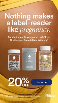 Questo template in formato Story promuove un bundle di integratori prenatali, mettendo in primo piano tre flaconi (ferro, colina e multivitaminico prenatale) come kit completo. Lo sfondo è un ritaglio lifestyle caldo e ravvicinato del pancione in una canotta gialla a costine: comunica subito il momento di vita e rende il messaggio immediatamente “per me”. In alto, un headline grande in sans-serif pulita guida la lettura; la parola “pregnancy” in corsivo stile serif aggiunge delicatezza e credibilità. Al centro, i packshot dei prodotti sono allineati e ben separati, facilitando la percezione di set. In basso, la leva commerciale è chiarissima: “20% OFF” molto grande e un pulsante CTA blu scuro (“first order”) che spinge all’azione. A livello strategico lavora in piena consideration su utenti già solution-aware: non spiega cos’è un prenatale, ma rassicura con sicurezza/trasparenza e con il valore del bundle. Cambiando sconto, CTA e combinazione dei flaconi, il layout si adatta facilmente a offerte in abbonamento o stack per trimestre mantenendo la stessa gerarchia vincente.