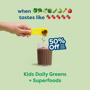 Questo template quadrato promuove un mix in polvere di greens e superfood per bambini pensato per entrare nella routine quotidiana senza battaglie a tavola. Il visual è costruito su un gesto chiaro: una mano versa la polvere da un misurino giallo in un bicchiere di bevanda color cacao, comunicando subito “si scioglie in un attimo” e “è buono da bere”. Lo sfondo verde pastello dà un tono pulito e salutare, mentre il lettering blu scuro e la fila di emoji verdure vs cioccolato raccontano il beneficio chiave: più nutrienti anche per chi è schizzinoso, con un gusto da premio. Il bollino grande “50% Off Your First Order” lavora in piena fase decisionale (BOF): sconto forte, percezione di rischio più bassa e invito immediato alla prova. In basso, “Kids Daily Greens + Superfoods” chiarisce l’offerta senza fronzoli. È facile personalizzarlo cambiando colore del misurino, claim gusto, percentuale sconto e ingredienti mostrati, mantenendo l’azione centrale che trasmette praticità e “accettazione” dai bambini.