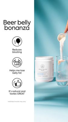Questo template Story 9:16 è pensato per un integratore in polvere “da sciogliere in acqua”, comunicato come soluzione semplice per pancia gonfia e grasso addominale ostinato. Il design è a split-screen pulito: a sinistra una colonna bianca con il titolo grande “Beer belly bonanza” e tre benefit in elenco verticale, ciascuno introdotto da un’icona (gonfiore ridotto, aiuto sul grasso della pancia, gusto ottimo), più una micro-disclaimer in basso che aggiunge serietà. A destra, un set fotografico teal mostra il barattolo accanto a un bicchiere mentre un misurino versa la polvere: una dimostrazione immediata di “si miscela con acqua” e della praticità d’uso. La tipografia sans-serif e il contrasto nero su bianco favoriscono lettura e memorabilità su mobile. A livello strategico lavora in TOF per pubblico solution-aware: aggancia il pain point, propone una checklist rapida e mostra il prodotto in azione, riducendo le frizioni. È facile personalizzarlo per collageni, greens, prebiotici o blend metabolici cambiando etichetta, colore di sfondo e claim in modo conforme.