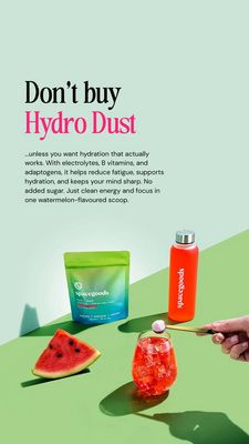 Questo template in formato Story 9:16 è pensato per promuovere un integratore in polvere per idratazione (elettroliti/flavored mix) con un gancio controcorrente che blocca lo scroll. Il titolo “Don’t buy…” in un serif deciso crea immediata curiosità, mentre il nome del prodotto in fucsia spicca sullo sfondo verde menta con un effetto “vibrant aesthetic”. Subito sotto, un paragrafo compatto spiega in modo credibile i vantaggi funzionali (elettroliti, vitamine del gruppo B, adattogeni, zero zuccheri aggiunti): perfetto per un pubblico ancora poco consapevole, in fase TOF, che ha bisogno di capire in pochi secondi “perché vale la pena provarlo”. La parte bassa mostra una scena pulita da studio: pouch del prodotto, borraccia arancione, bicchiere con bevanda rossa e ghiaccio, misurino in versamento e fetta di anguria come segnale di gusto. Le ombre nette e la luce brillante trasmettono freschezza e affidabilità. È facile personalizzarlo cambiando pack, colore della bevanda e 3–4 benefit chiave mantenendo la stessa struttura ad alto impatto.