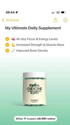 Questo template Story 9:16 è pensato per promuovere gummies di creatina monoidrato con un’impostazione pulita e centrata sulla credibilità. La fascia superiore riprende volutamente l’aspetto di una nota su smartphone: titolo in grassetto (“My Ultimate Daily Supplement”) e tre punti beneficio con icone/emoji (focus ed energia, forza e massa muscolare, densità ossea) che rendono la proposta immediata e leggibile a colpo d’occhio. Al centro, layout product-centered: un unico barattolo in evidenza su uno sfondo sfumato menta–turchese, con molto “respiro” visivo per far percepire il prodotto come premium. In basso, un badge arrotondato di riprova sociale comunica “5/5 su Trustpilot con 200+ recensioni”, riducendo l’ansia d’acquisto tipica della fase di considerazione. Funziona per utenti solution-aware che stanno confrontando integratori per performance, perché unisce benefici rapidi e validazione esterna. Personalizza sostituendo i bullet con claim conformi, aggiornando fonte e numero di recensioni e adattando sfondo e accenti al tuo brand senza perdere la pulizia del design.