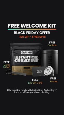 Questo template funziona in fase decisionale perché mette l’offerta al centro in modo inequivocabile: headline “FREE WELCOME KIT”, richiamo Black Friday e una percentuale di sconto concreta accompagnata da “4 free gifts”. La leva psicologica è doppia: urgenza (cornice stagionale da promo) e value stacking (più omaggi tangibili) che alzano il valore percepito e riducono l’attrito sul prezzo rispetto ad altri brand di creatina. Il pubblico è product-aware, quindi non serve “spiegare” la creatina: qui si spinge sulla scelta del brand con criteri chiari—risparmio, accessori utili e un benefit sintetico (“massima efficacia e zero gonfiore”). L’estetica scura e ad alto contrasto richiama il mondo palestra, mentre le etichette “FREE” rendono immediatamente verificabile cosa arriva a casa: best practice BOF dove vince la chiarezza.