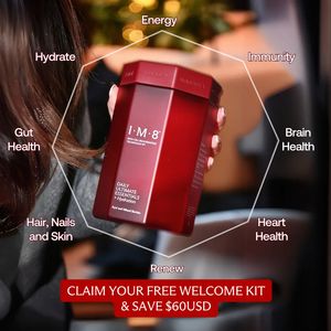 Questo template quadrato per integratori è pensato per un drink mix benessere quotidiano e punta su una foto lifestyle “vera”: il barattolo rosso viene mostrato in mano, così l’uso risulta immediato e credibile. Un contorno poligonale bianco crea una cornice pulita attorno al prodotto e ospita i claim di beneficio disposti a raggiera (Energy, Immunity, Brain/Heart Health, Renew, Hydrate, Gut Health, Hair/Nails/Skin). Lo sfondo caldo con luci sfocate mantiene l’attenzione sul packaging, mentre la tipografia bianca ad alto contrasto rende i messaggi leggibili anche da mobile. In basso, una fascia CTA rossa molto evidente con “Claim your free welcome kit & save $60 USD” introduce un forte incentivo di valore, ideale per TOF e per utenti “unaware” che non stanno cercando attivamente un integratore. La creatività combina curiosità (tanti benefici in un solo prodotto), aspirazione (energia e benessere quotidiano) e valore (kit omaggio + risparmio). Personalizzarla è semplice: sostituisci lo scatto del prodotto, aggiorna i benefit della raggiera e modifica l’offerta mantenendo il contrasto rosso/bianco.