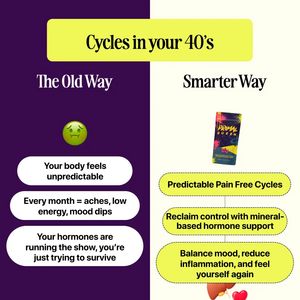 Questo template quadrato a schermo diviso è pensato per promuovere integratori di supporto ormonale rivolti alle donne che notano cambiamenti del ciclo intorno ai 40 anni. Il visual crea un confronto immediato: a sinistra un pannello viola scuro “The Old Way”, a destra un pannello avorio “Smarter Way”, impostando una narrazione problema/soluzione chiarissima. Sul lato sinistro, tre box bianchi arrotondati elencano i disagi più riconoscibili—corpo imprevedibile, dolori mensili, poca energia, cali d’umore—rafforzati da un’icona “nauseata”. A destra, callout gialli con bordo tratteggiato sintetizzano il risultato desiderato: cicli più prevedibili e senza dolore, supporto ormonale a base di minerali, umore più stabile e infiammazione ridotta. La barra titolo gialla in alto rende il messaggio leggibile a colpo d’occhio. A livello strategico è perfetto per la fase di considerazione: parla a un pubblico già “solution-aware”, valida il problema e introduce un motivo di credibilità (“a base di minerali”) senza risultare tecnico. Personalizzabile cambiando packshot, benefit e colori mantenendo il forte contrasto del confronto.