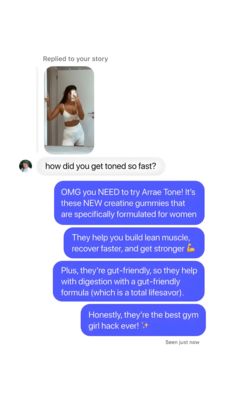 Questo concept funziona perché prende in prestito la credibilità dei messaggi privati: una domanda in arrivo suggerisce risultati reali, attivando curiosità e aspirazione senza dover ricorrere a promesse “miracolose”. Il framing da consiglio tra amiche è una riprova sociale potente per un pubblico unaware/top of funnel: non sta cercando la creatina, sta reagendo a un obiettivo comune (“tonificarsi in fretta”). I fumetti in sequenza spezzano l’argomentazione in step leggibili: prima il nome del prodotto, poi i benefici principali (massa magra, recupero, forza), infine un elemento distintivo “gut-friendly” che disinnesca obiezioni tipiche. Lo stile pulito da screenshot e il dettaglio “Seen just now” aumentano l’autenticità percepita, facendo sembrare il contenuto vero UGC—best practice ideale per le Story.