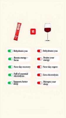 Questo template Story 9:16 promuove un mix di elettroliti in stick monodose mettendolo a confronto, in modo immediato, con un bicchiere di vino rosso. Il design è minimale e ordinato su fondo avorio: in alto compaiono le due icone (stick vs calice) con un badge rosso “VS” al centro. Sotto, cinque box arrotondati creano una lettura rapidissima: a sinistra interruttori verdi con i vantaggi (reidratazione, energia e focus, recupero il giorno dopo, elettroliti essenziali, sonno migliore), a destra interruttori rossi con gli effetti negativi dell’alcol (disidrata, scarica energie, “regret” il giorno dopo, zero elettroliti, disturba il sonno). È perfetto per la fase di considerazione: il pubblico è già orientato alla soluzione e qui trova una comparazione che traduce le caratteristiche in benefici concreti. La codifica colore riduce lo sforzo mentale e rende la scelta “giusta” intuitiva. Personalizzalo sostituendo lo stick, adattando i claim alla tua formula (magnesio, sodio, senza zucchero) e cambiando l’“avversario” con la tua alternativa tipica (caffè, bibite, energy drink).
