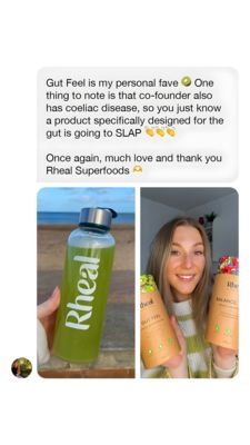 Funziona perché replica il linguaggio visivo dei messaggi privati: una recensione lunga e ricca di dettagli dentro un fumetto sembra spontanea e quindi più credibile del classico copy di brand. Questo potenzia il trigger principale—riprova sociale—e la citazione della founder credibility aggiunge un ulteriore livello di fiducia, cruciale nel mondo integratori. In fase MOF/considerazione, un pubblico solution-aware non ha bisogno di essere convinto “perché l’intestino conta”, ma di capire se quella specifica miscela vale la prova. Il collage a due foto lo dimostra: da un lato la bevanda pronta (con colore reale e appetibile), dall’altro una persona che mostra le confezioni (validazione umana). Tipografia pulita su sfondo bianco = lettura immediata in Stories, con abbastanza sostanza da ridurre lo scetticismo.