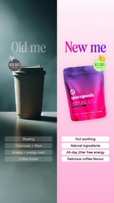 Questo template sfrutta due leve forti: curiosità e risparmio. Il confronto è immediato—tazza take-away costosa contro pouch di polvere con badge “per cup” più basso—e spinge l’utente a fare il calcolo mentale in un secondo. Il frame “Old me / New me” lavora sull’identità: non stai solo comprando un prodotto, stai “aggiornando” la tua routine. La colonna di sinistra elenca i pain point (gonfiore, chimici, ansia/calo) rendendo lo status quo poco desiderabile anche al di là del prezzo. È perfetto per fase MOF con pubblico già consapevole della soluzione: non deve educare, ma convincere a cambiare. Benefit in pillole (ingredienti naturali, gut soothing, energia stabile) + gerarchia visiva netta riducono lo sforzo di lettura su mobile e rispettano le best practice per le Story: contrasto alto, claim brevi, un messaggio principale memorabile.