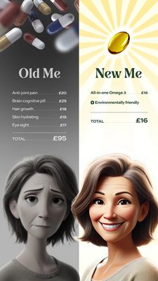 Questo concept funziona perché trasforma la promessa dell’integratore in una storia economica chiarissima. Il pannello “Old Me” elenca vari prodotti “per singolo problema” con prezzi separati: crea ancoraggio e un leggero fastidio da spesa. Il pannello “New Me” scioglie subito la tensione con una sola perla di Omega‑3 e un totale molto più basso. I volti prima/dopo aggiungono un segnale emotivo di miglioramento, leggibile in un secondo. È adatto al TOF awareness su pubblico già solution‑aware: le persone cercano supporto per articolazioni, mente e benessere generale, ma sono indecise su cosa acquistare. Reimpostando la scelta su semplificazione e risparmio, riduce il sovraccarico decisionale e aumenta il valore percepito. Buone pratiche: contrasto netto a due colonne, tipografia “scontrino” che dà credibilità e una riga di prova/posizionamento (es. sostenibilità) facilmente sostituibile con il differenziante più forte del brand.