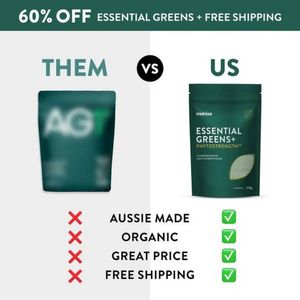 Questo template quadrato è pensato per un integratore “greens” in polvere e usa un confronto diretto con i competitor per spingere la fase di valutazione. Una fascia superiore verde scuro mette subito in primo piano l’offerta (“60% OFF… + FREE SHIPPING”), creando un gancio immediato basato sul valore. Il layout è diviso in due colonne “THEM vs US”: a sinistra una busta volutamente sfocata e generica, a destra un packshot nitido e curato, che comunica qualità e affidabilità in modo istantaneo. Nella parte bassa, una checklist essenziale confronta i criteri decisivi (Aussie made, organic, great price, free shipping) con X rosse contro spunte verdi, rendendo la scelta quasi automatica. Il design è pulito, con font sans-serif, contrasto alto e molto spazio bianco: leggibilità perfetta in feed. A livello psicologico combina competizione, risparmio e “prova” visiva strutturata, riducendo il rischio percepito per utenti già consapevoli della soluzione. Personalizza l’offerta in testata, sostituisci i punti con i tuoi plus (es. test di laboratorio, zero additivi) e aggiorna il pack mantenendo la logica ‘noi vinciamo’.