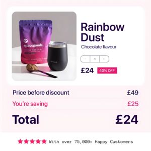 Questo template quadrato è pensato per promuovere un integratore in polvere da sciogliere in acqua/latte (mix per focus, energia, benessere o produttività) in busta stand-up. Il layout richiama volutamente una schermata “checkout”: foto prodotto grande a sinistra (busta, misurino con polvere e bicchiere), a destra nome prodotto e gusto, con un selettore quantità che comunica subito “pronto all’acquisto”. Il prezzo è protagonista: £24 in grande, badge “40% OFF” ad alto contrasto e un box riepilogo con “prezzo prima dello sconto”, “stai risparmiando” e “Totale”, così l’utente capisce il valore in un colpo d’occhio. A livello di strategia, lavora perfettamente in fase decisionale: sconto chiaro, risparmio esplicitato e riprova sociale forte (5 stelle + “75.000+ clienti felici”). Lo sfondo rosa cipria e la tipografia blu notte mantengono un tono premium, mentre il magenta guida l’occhio sull’offerta. È facile personalizzarlo cambiando pack, gusto, valuta e modulo risparmio per bundle, abbonamenti o edizioni limitate.