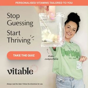 Questo template quadrato per integratori è pensato per promuovere vitamine quotidiane personalizzate e pack su misura. La composizione è chiara e bilanciata: headline grande in font serif a sinistra (“Stop Guessing Start Thriving”) e foto lifestyle a destra con una persona sorridente che mostra in primo piano una bustina trasparente con le vitamine. La fascia superiore color corallo ribadisce la promessa (“Personalised vitamins tailored to you”) e il pulsante corallo, arrotondato e ben visibile (“TAKE THE QUIZ”), guida l’azione principale. A livello visivo, i toni caldi pesca/corallo staccano su uno sfondo neutro e morbido; piccoli segni tipo “doodle” e la nota “Home-compostable” aggiungono un tocco editoriale e un messaggio sostenibile senza appesantire. Sul piano marketing funziona perfettamente in top-of-funnel con pubblico “unaware”: trasforma il problema in “stai andando a tentativi” e propone un passo facile (il quiz), attivando curiosità, desiderio di migliorarsi e comodità. È semplice personalizzarlo per energia, difese, sonno o stress mantenendo intatta la gerarchia di headline e CTA.
