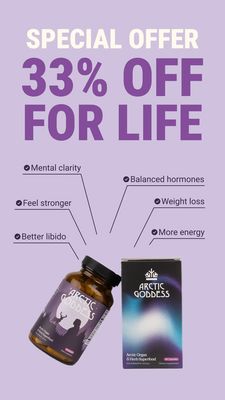 Questa creatività è costruita per la fase BOF (decisione) su un pubblico già “product-aware”. Il gancio principale è lo “33% OFF” enorme: la leva dello sconto, rinforzata dal “for life”, aumenta il valore percepito e spinge a decidere subito. Subito dopo, l’elenco benefici funziona come giustificazione rapida: risponde alle domande più comuni orientate al risultato (energia, chiarezza mentale, ormoni, peso) senza richiedere testo lungo. Lo sfondo tinta unita e il contrasto del viola migliorano la leggibilità su mobile, mentre il doppio pack shot (flacone + scatola) dà concretezza e riduce la sensazione di rischio. È un buon esempio di best practice conversion: un’offerta dominante, benefit scansionabili in stile “proof”, e identificazione del prodotto chiara—perfetto per retargeting e periodi promozionali.