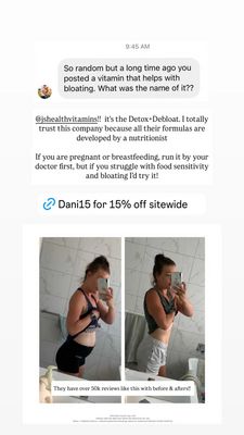 Questo template in formato Story 9:16 è pensato per integratori di supporto digestivo, in particolare formule “sgonfia pancia” e per sensibilità alimentari. La creatività replica lo stile di uno screenshot del telefono: sfondo bianco pulito, orario in alto e conversazione in stile DM con domanda/risposta che sembra davvero arrivare da una community. È un approccio perfetto per un pubblico già product-aware nella fase di considerazione, perché suona spontaneo e credibile. Sotto al testo compare una riga promo ben visibile (“15% off sitewide”) che introduce l’incentivo senza appesantire la grafica. Nella metà inferiore c’è un prima/dopo in due foto speculari, che attiva il trigger di trasformazione, mentre il riferimento alle recensioni rafforza la riprova sociale. Funziona perché unisce segnali di fiducia (formule sviluppate da un nutrizionista, nota di cautela) a un’immagine realistica e quotidiana. Puoi personalizzarlo sostituendo handle, codice sconto e testo del DM, adattando benefit e claim in modo coerente con il tuo brand e con le policy (meno gonfiore, più comfort dopo i pasti, pancia meno “tesa”).