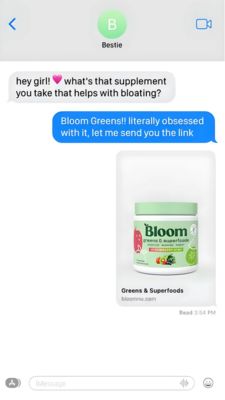 Questo template sfrutta riprova sociale e praticità: l’interfaccia iMessage comunica subito “consiglio tra pari”, abbassando la diffidenza tipica degli integratori. L’incipit problem-first (“aiuta col gonfiore?”) è perfetto per un pubblico solution‑aware: non va convinto che la categoria funzioni, ma che questo prodotto sia quello giusto. In fase MOF (considerazione) l’utente cerca segnali di popolarità e semplicità d’uso; il “ti mando il link” diventa una CTA morbida, coerente con la conversazione, senza sembrare aggressiva. A livello di best practice, la comprensione è immediata (due messaggi), la gerarchia è chiara (bubble blu come frase chiave) e la card prodotto pulita garantisce riconoscibilità e destinazione. Il risultato è un passaparola credibile con un focus netto sulla conversione.