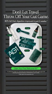 Questo template 9:16 in formato Story promuove un integratore per il benessere intestinale (greens in polvere) con un posizionamento “perfetto in viaggio”. Il design gioca su un forte contrasto: sfondo antracite a listelli, vassoio bianco centrale in stile flat-lay/unboxing e prodotti disposti in modo ordinato (busta di polvere, stick monodose, shaker, misurino e boccetta con contagocce). I piccoli badge “Free” vicino a ogni elemento rendono l’offerta immediata da capire e aumentano la percezione di valore. In alto, un headline serif grande (“Don’t Let Travel Throw Off Your Gut Game.”) cattura l’attenzione; subito sotto una statistica di miglioramento della digestione aggiunge credibilità anche a chi non conosce ancora il brand. È un approccio TOF: parla a chi sta viaggiando e sente un disagio comune, senza richiedere conoscenze pregresse, e abbassa la barriera d’ingresso con il “welcome kit gratis”. Personalizzalo sostituendo la composizione dei prodotti, aggiornando la statistica con claim compliant e mantenendo una CTA verde ad alto contrasto per preservare la gerarchia visiva.