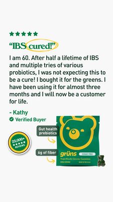Questo template in formato Story 9:16 è pensato per promuovere gummies per il benessere intestinale e punta tutto sulla riprova sociale: un headline d’impatto (“IBS cured!”) evidenziato in verde e cer...