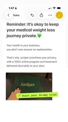 Questo template in formato Story 9:16 è pensato per promuovere un programma di dimagrimento medico con percorso online e consegna a domicilio in modo discreto. Il layout replica l’interfaccia delle Note sullo smartphone, creando subito l’effetto “messaggio personale” e quindi massima riservatezza. Il titolo grande rassicura (“va bene tenere privata la tua esperienza”), poi un testo breve spiega il valore: salute come fatto personale, programma 100% online e trattamento recapitato con discrezione. Nella parte bassa entra la prova visiva con la foto del packaging (scatola verde scuro con brand) e una CTA ad altissimo contrasto in verde lime: “Start your 30-day trial”, con icona link che invita al tap. Spazi bianchi, font pulito e accenti verdi comunicano fiducia e serenità—perfetti per una fase di considerazione, quando l’utente cerca un fornitore affidabile e “senza imbarazzo”. Personalizzalo sostituendo la foto della box, adattando l’incentivo (trial, consulenza, verifica idoneità) e riscrivendo la frase “Reminder” per mettere in primo piano il tuo vantaggio competitivo senza perdere l’effetto confidenziale.